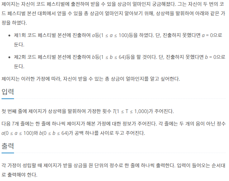 | <실행코드> - JAVA import java.util.Scanner; public class Main { public static void main(String[] args) { Scanner sc = new Scanner(System.in); int a = sc.nextInt(); for( int i =0; i<a; i++) { int x = sc.nextInt(); int y= sc.nextInt(); int total1=0 ; int total2=0 ; if (x == 1) total1+=5000000; // 1등을 했을 때의 상금 else if ( x>= 2 && x<= 3) total1+=3000000; // 2등을 했을 때의 상금 else if ( x>=4 && x<= 6) total1+=2000000; // 3등을 했을 때의 상금 else if ( x>= 7 && x<= 10 ) total1+= 500000; // 4등을 했을 때의 상금 else if ( x>= 11 && x<= 15) total1+=300000; // 5등을 했을 때의 상금 else if ( x>= 16 && x<=21) total1+=100000; // 6등을 했을 때의 상금 else total1 = 0 ; if (y== 1) total2+=5120000;// 1등을 했을 때의 상금 else if ( y>= 2 && y<= 3) total2+=2560000; // 2등을 했을 때의 상금 else if ( y>=4 && y<= 7) total2+= 1280000; // 3등을 했을 때의 상금 else if ( y>= 8 && y<= 15 ) total2+= 640000; // 4등을 했을 때의 상금 else if ( y>= 16 && y<= 31) total2+= 320000; // 5등을 했을 때의 상금 else total2 = 0 ; System.out.println(total1+ total2); //2017년 2018년 total를 더한값 } sc.close(); //Scanner 닫기 } } |