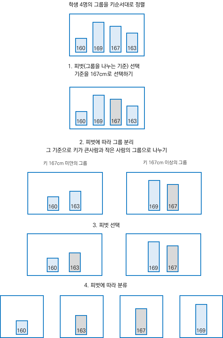 그룹을 나누기 위해서는 피벗 이하의 요소를 배열 왼쪽으로, 피벗 이하의 요소들을 오른 쪽으로 옮겨야 한다.