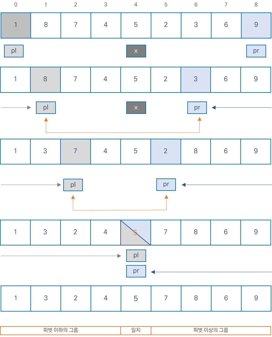 pl이 위치한 지점은 피벗값이 이상의 요소가 있는 지점이고 pr이 위치한 지점은 피벗 이하의 요소가 있는 지점이다.