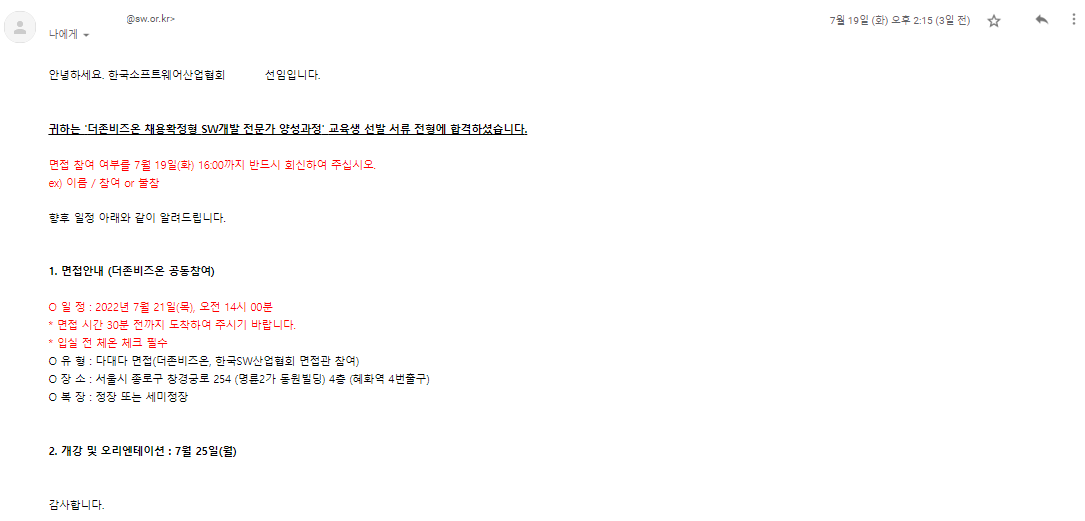 7월 19일 (목) SW협회에서 한통의 메일이 왔다.